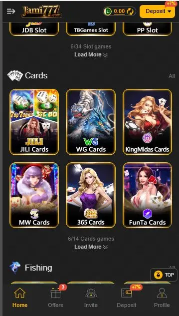 Users of the Jami 777 Real Money Game can explore different categories, such as: